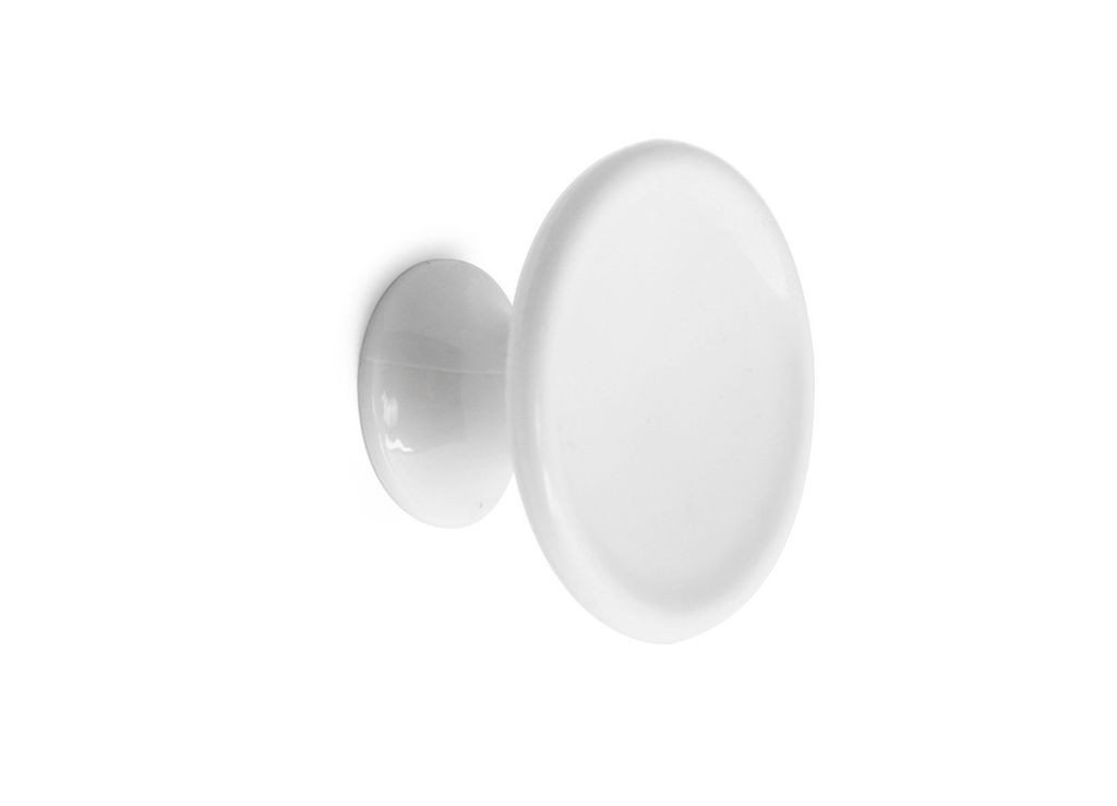 Enkel vit knopp av plast. Passar till de flesta lådor och skåp.