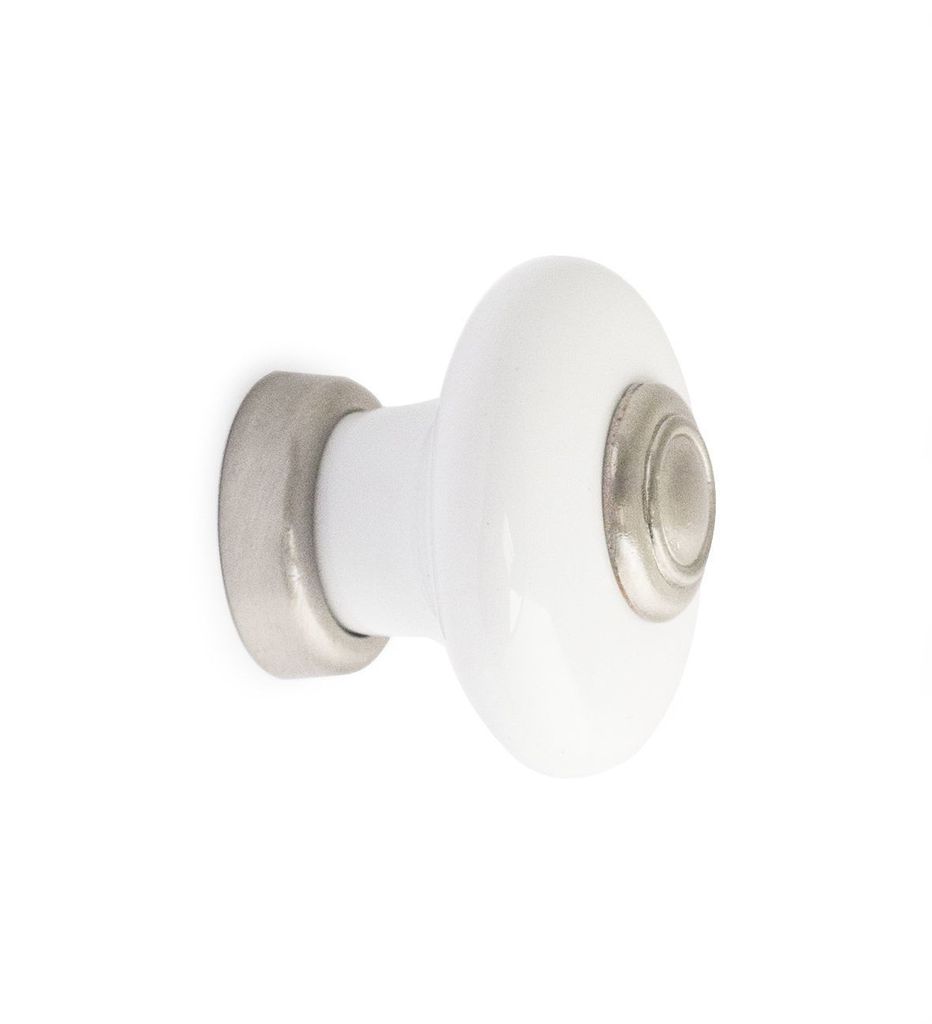 Knopp av vit porslin. Detaljer i borstat nickel. Knopp i traditionell stil som passar till de flesta lådor och skåp.