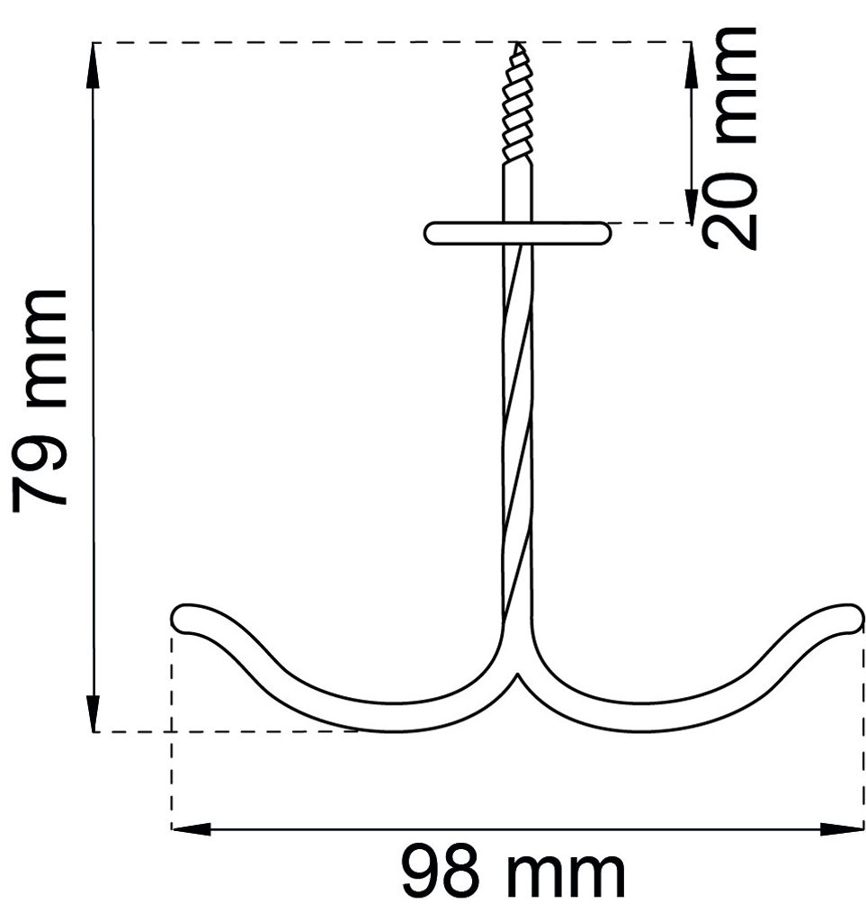 Dubbel trådkrok av stål med trägänga. Används i tak, under hyllor osv.