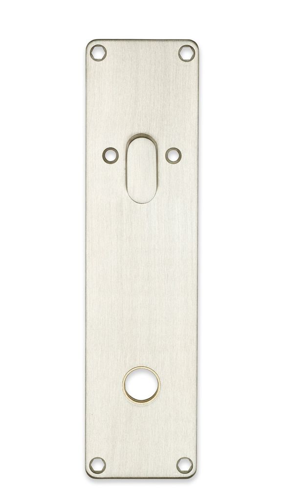 Långskylt av borstat syrafast stål med cylindervred och hål för fästskruvar för utvändig cylinderring. För låshus av typ modul/connect.