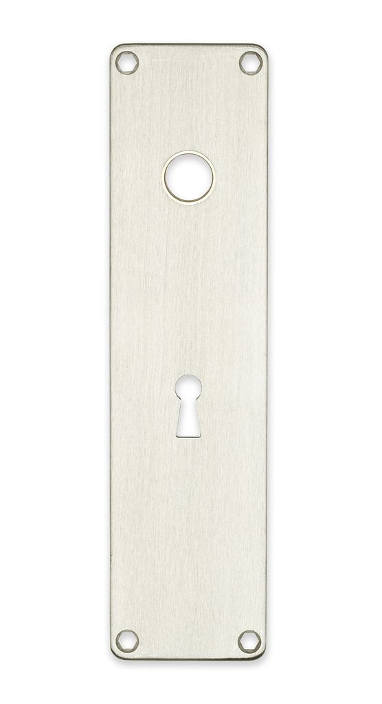 Långskylt av borstat rostfritt stål. Med hål för handtag och nyckel.