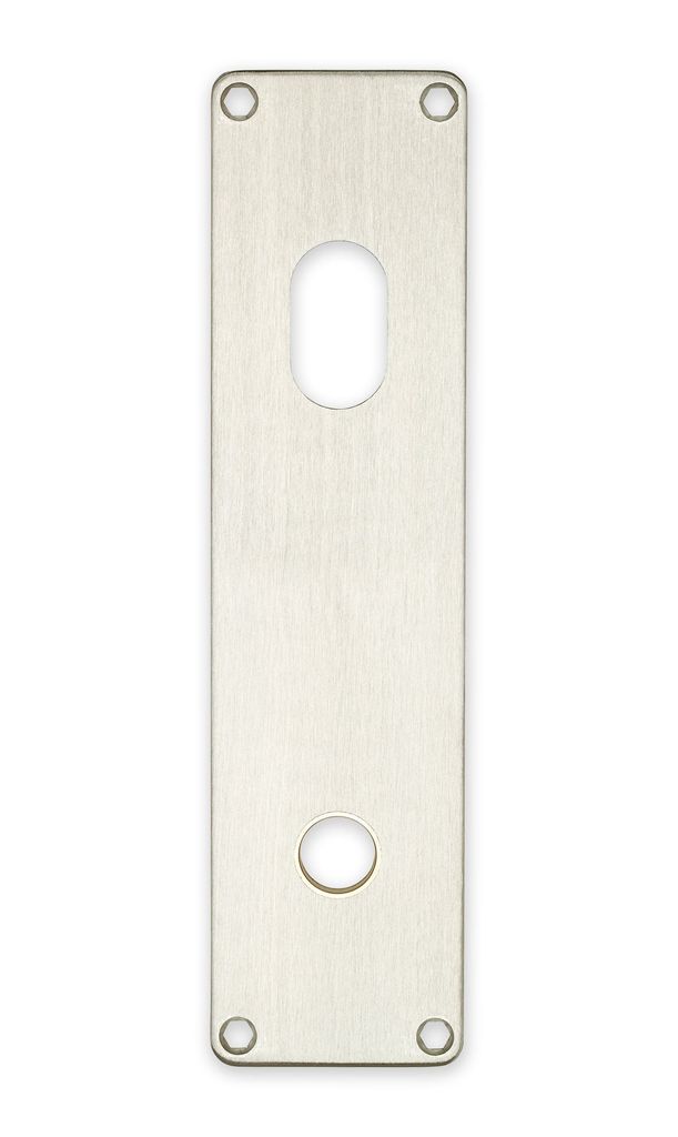 Långskylt av borstat rostfritt stål med cylindervred. Med hål för handtag och passande låshus av typ modul/connect.