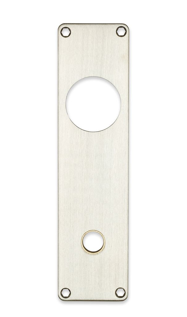 Långskylt av borstat syrafast stål för dörrhandtag med hål för cylinder och cylinderring. För dörr med låshus av typ modul/connect.