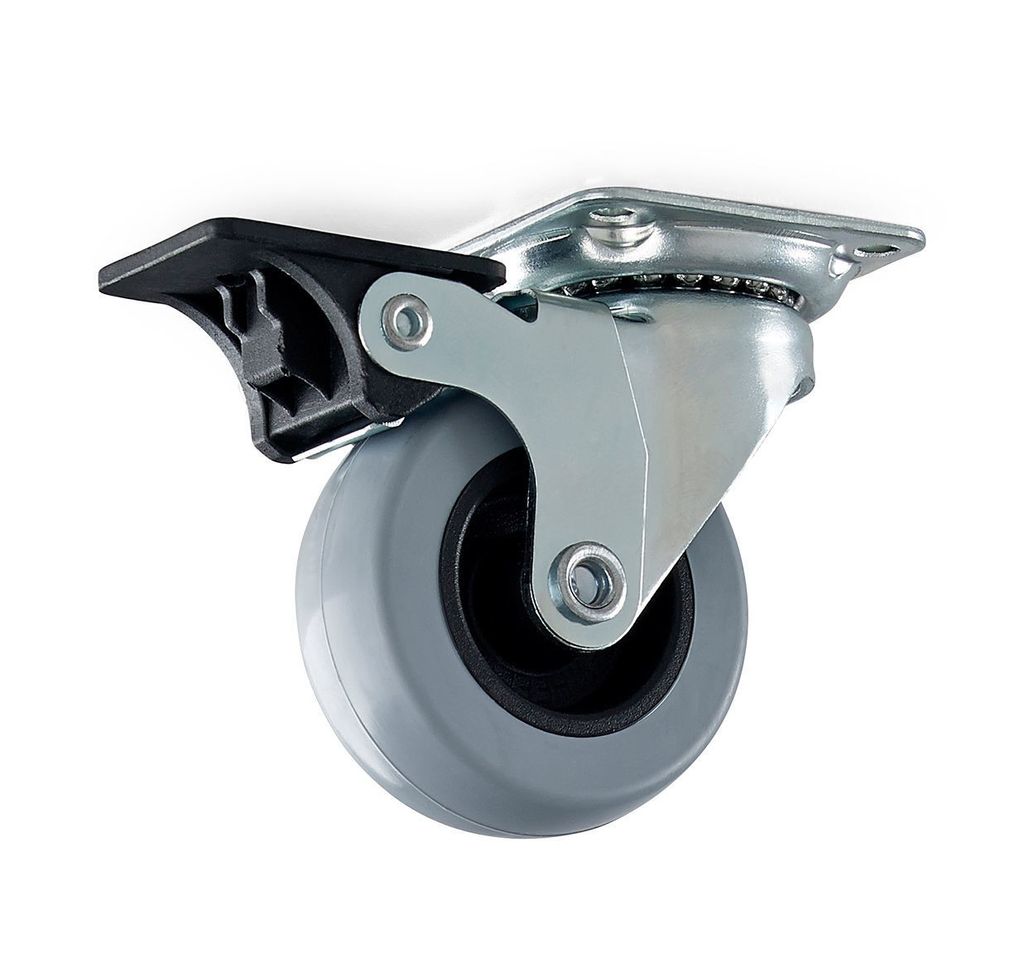 Svängbart möbelhjul av stål med platta och hjulbroms. Hjul av polyuretan (PUR), Ø 50 mm.
