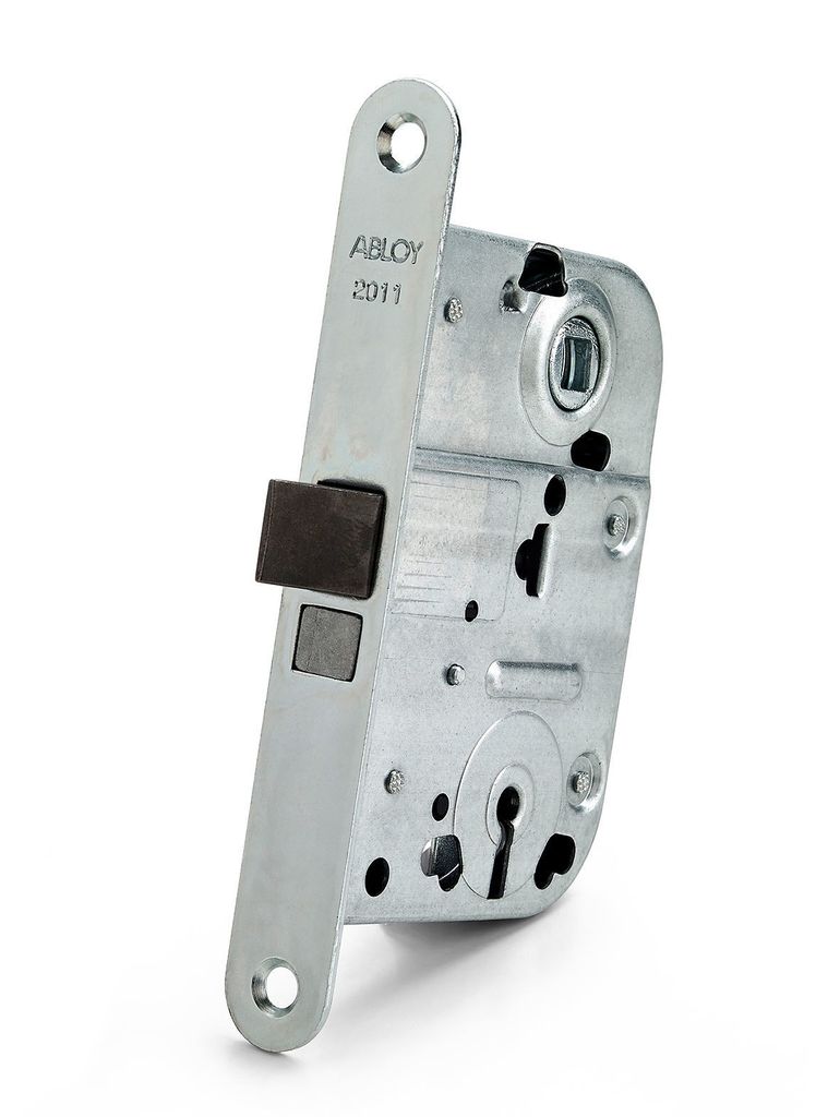Låshus av stål med 5 tillhållare. Vändbart tryckesfall för höger- eller vänsterhängda dörrar. Lämplig vid behov av låsning av mellandörr inomhus.