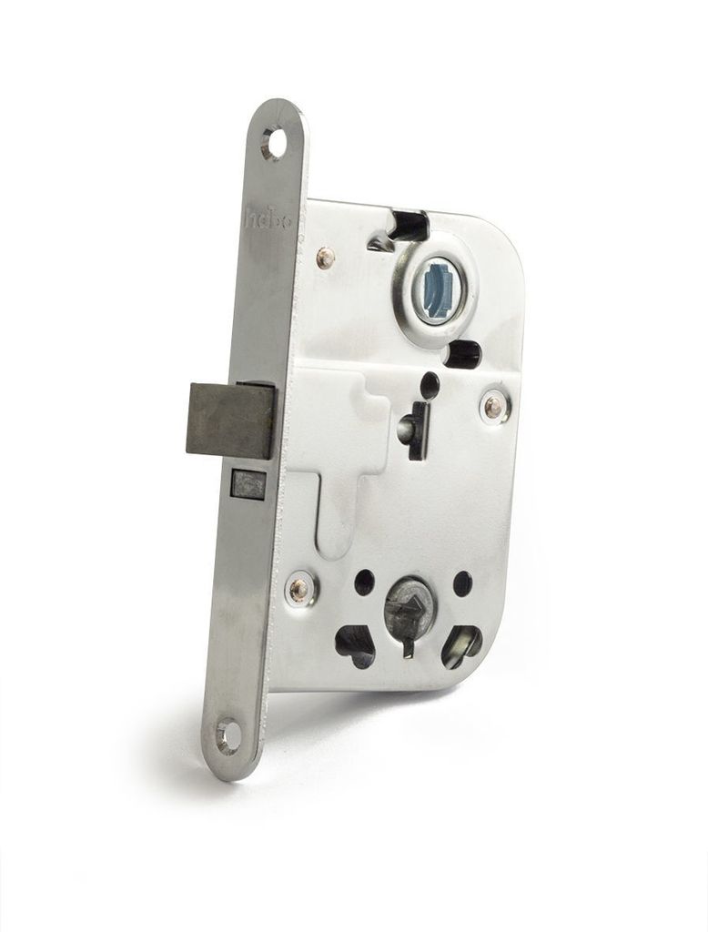 Låshus av stål för symmetrisk montering på innerdörrar. Passar för såväl höger- som vänsterhängda dörrar genom vändbart tryckesfall.