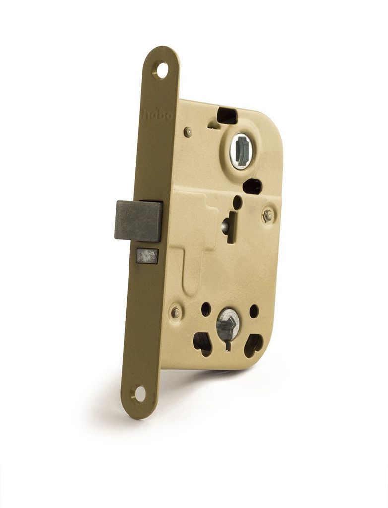 Låshus av stål för symmetrisk montering på innerdörrar. Passar för såväl höger- som vänsterhängda dörrar genom vändbart tryckesfall.