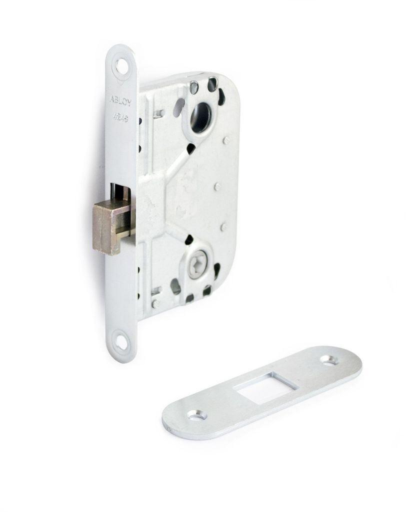 Låshus med hakregel. För skjutdörrar till innerdörrar samt badrums- och toalettdörrar.