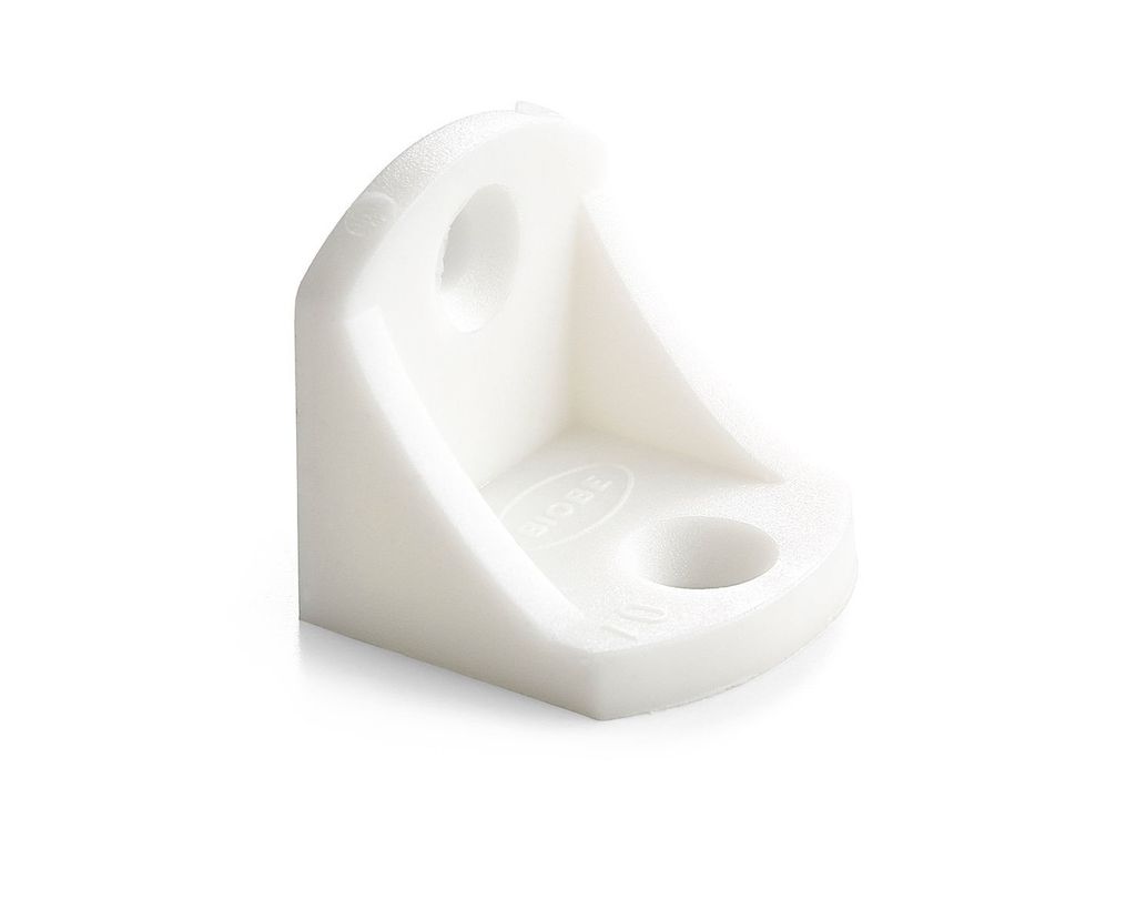 Möbelvinkel av vit plast. För att fästa två ytor exempelvis vid byggnation av skåp och hyllor.