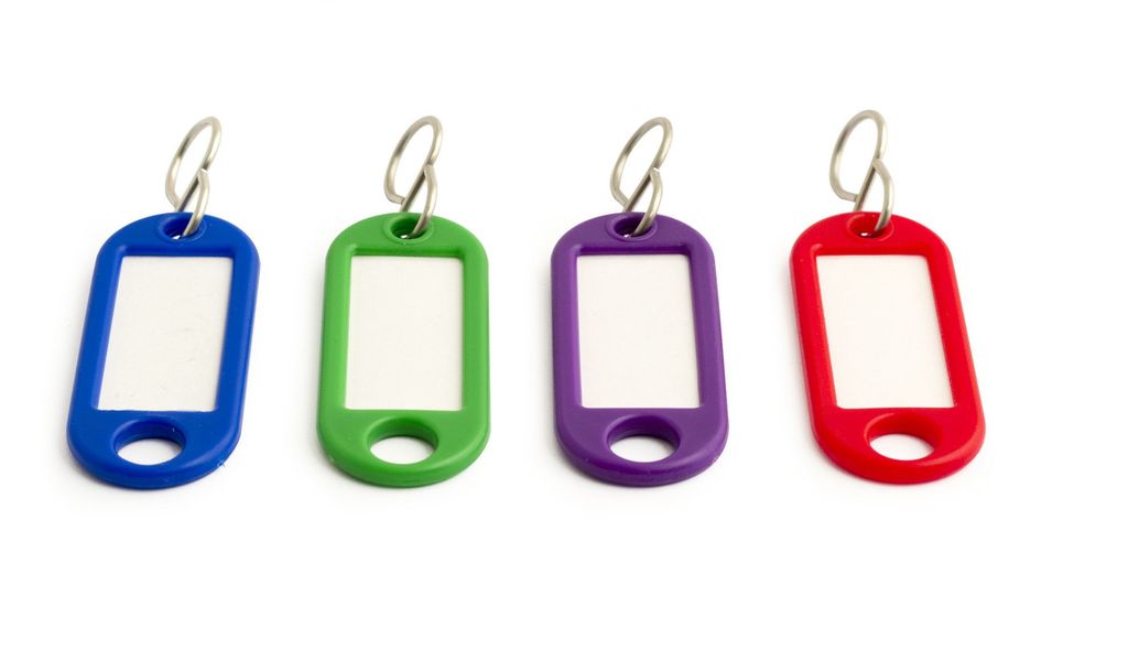 Nyckelbricka av plast med fönster, 53x22 mm. Sorterade färger.