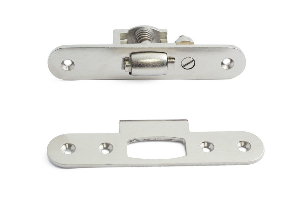Rullås av mattförnicklad mässing med justerbar tryckrulle. Används till enklare innerdörrar med draghandtag när man vill hålla dörren stängd men inte låst.