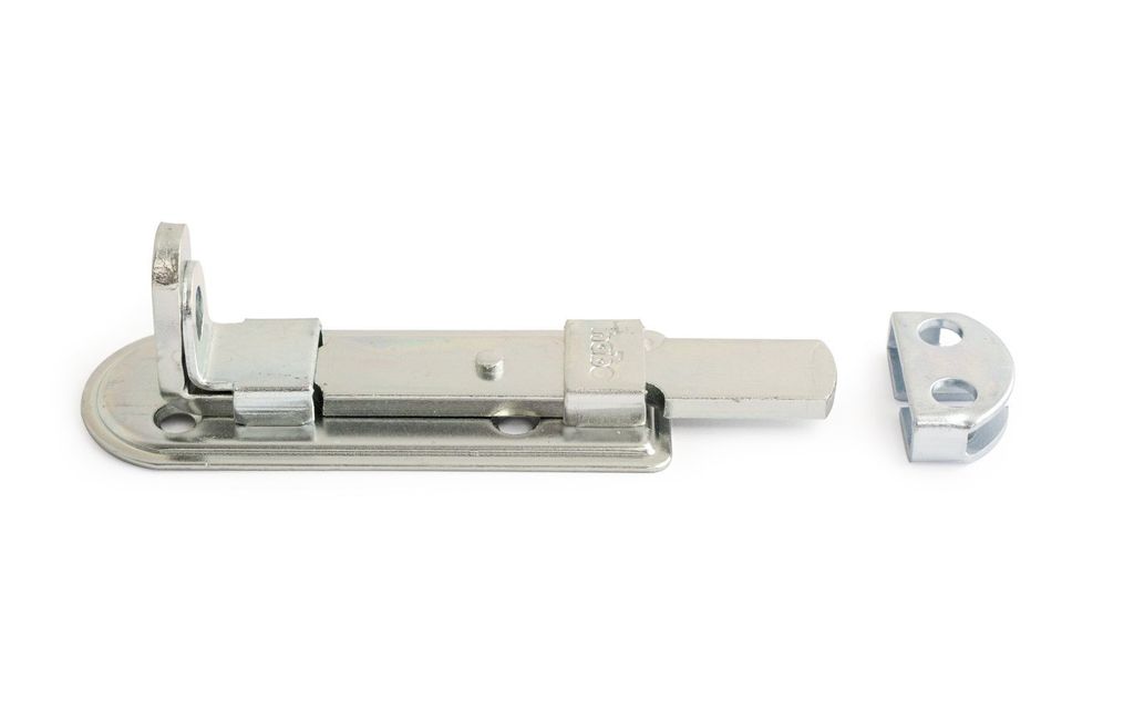 Skjutregel av elförzinkat stål. Kan låsas med hänglås med max 8 mm bygel.