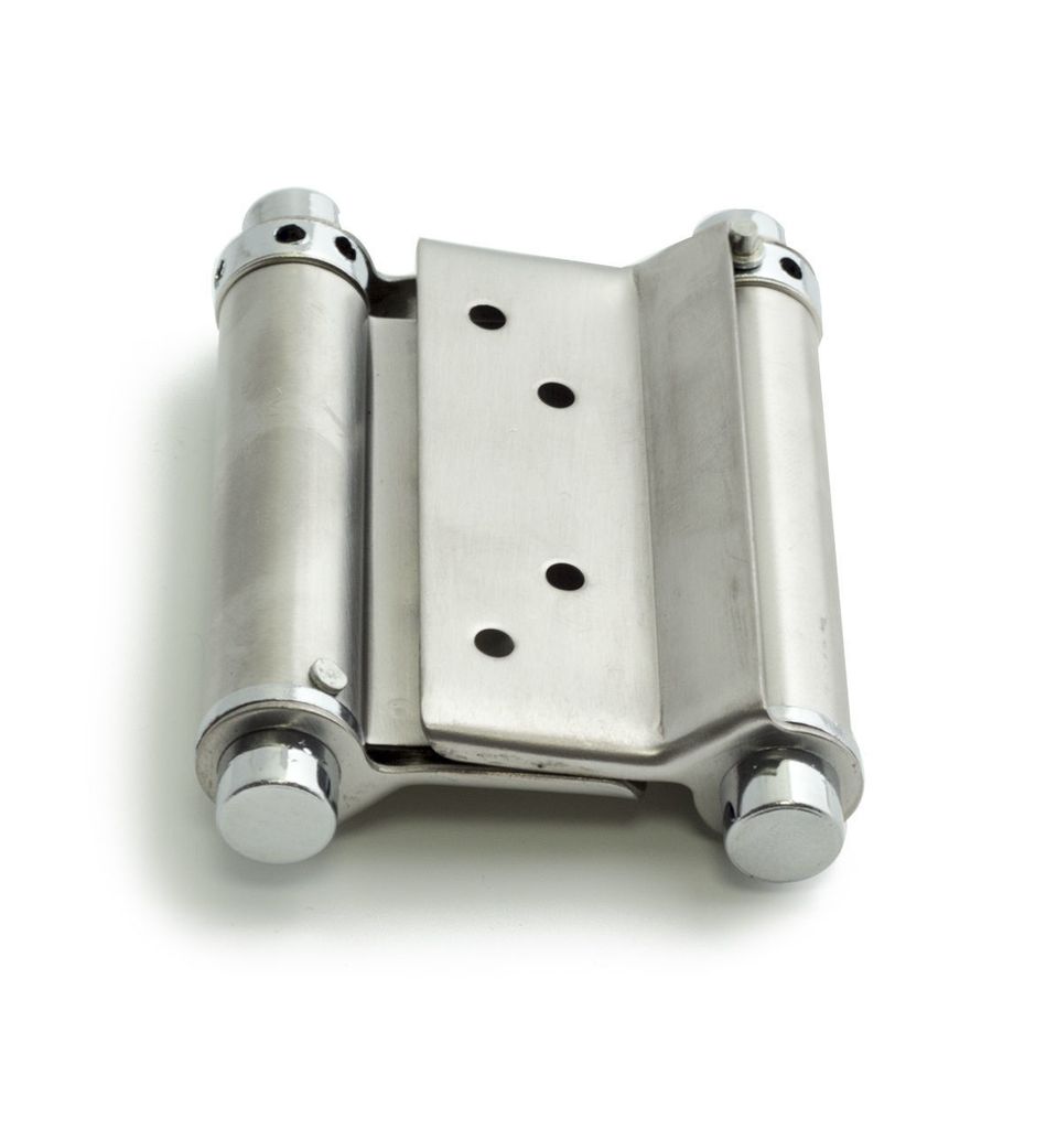 Dubbelverkande svängdörrsgångjärn av stål med justerbar stängningskraft.
