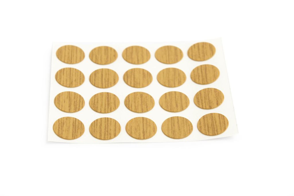 Självhäftande täckbricka av tunn plast. Avsedd för att täcka befintliga hål i exempelvis karm.