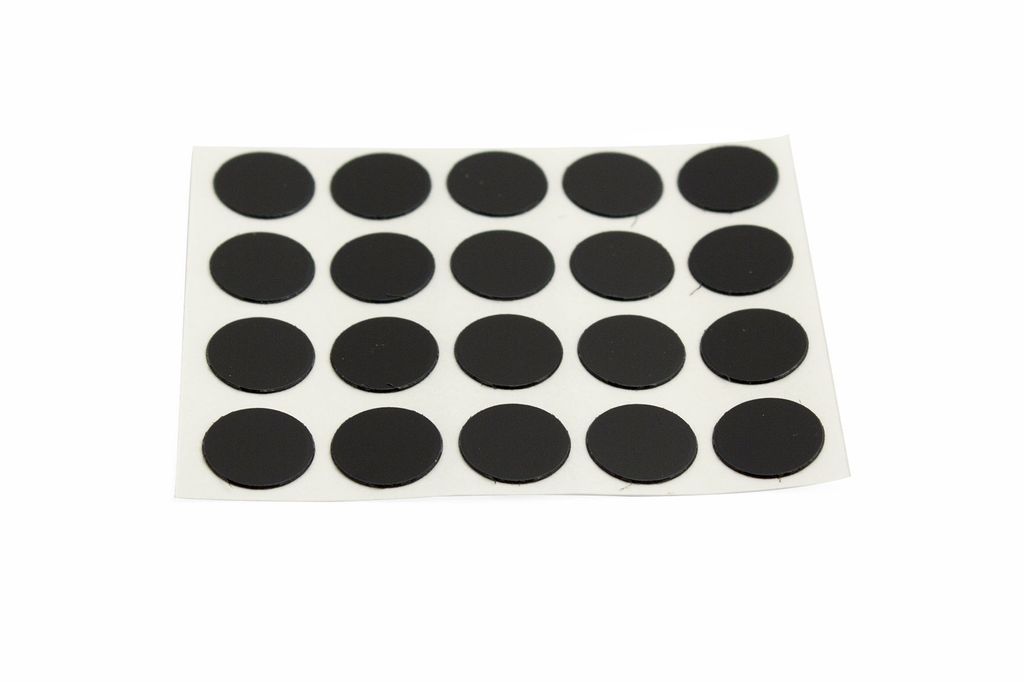 Självhäftande täckbricka av tunn plast. Avsedd för att täcka befintliga hål i exempelvis karm.
