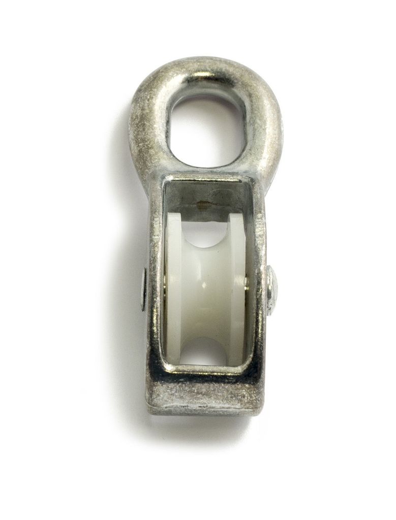 Talja av zamak. Ø 25 mm, enkelhjul. För rep 7 mm.