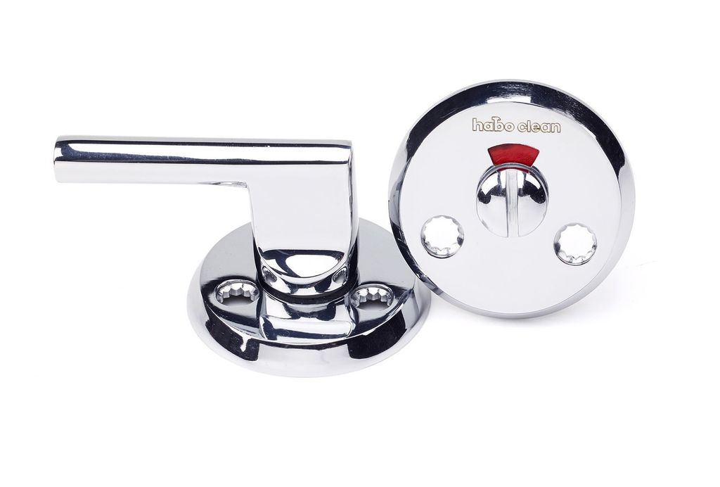 WC-beslag av blyfri mässing. Avsett för handikapptoalett. Passar till dörrtjocklek 38-42 mm.
