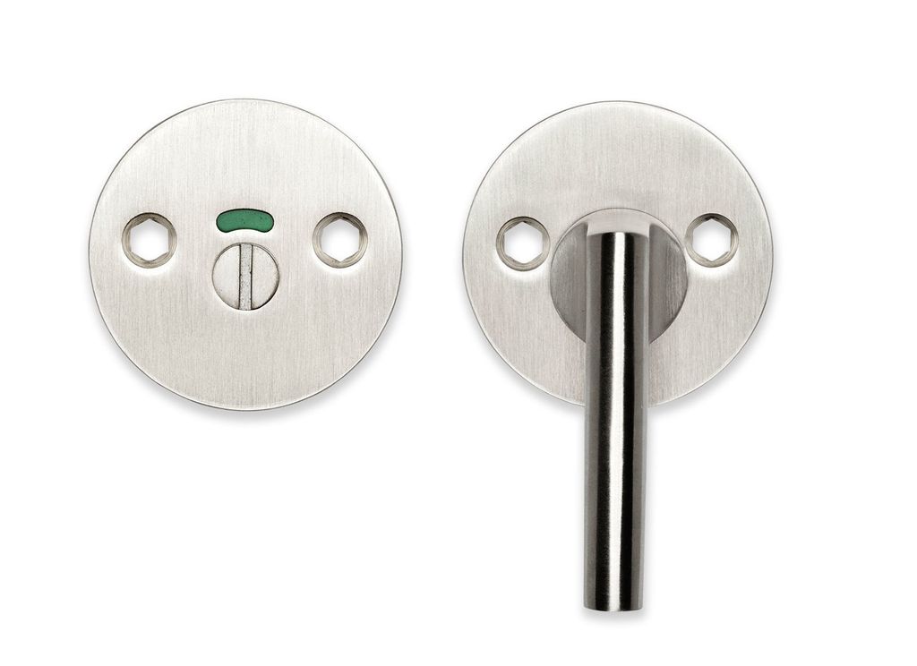 WC-beslag av rostfritt syrafast A4-stål med borstad yta i Habos 316-serie med dörrhandtag och behör. För handikapptoalett.