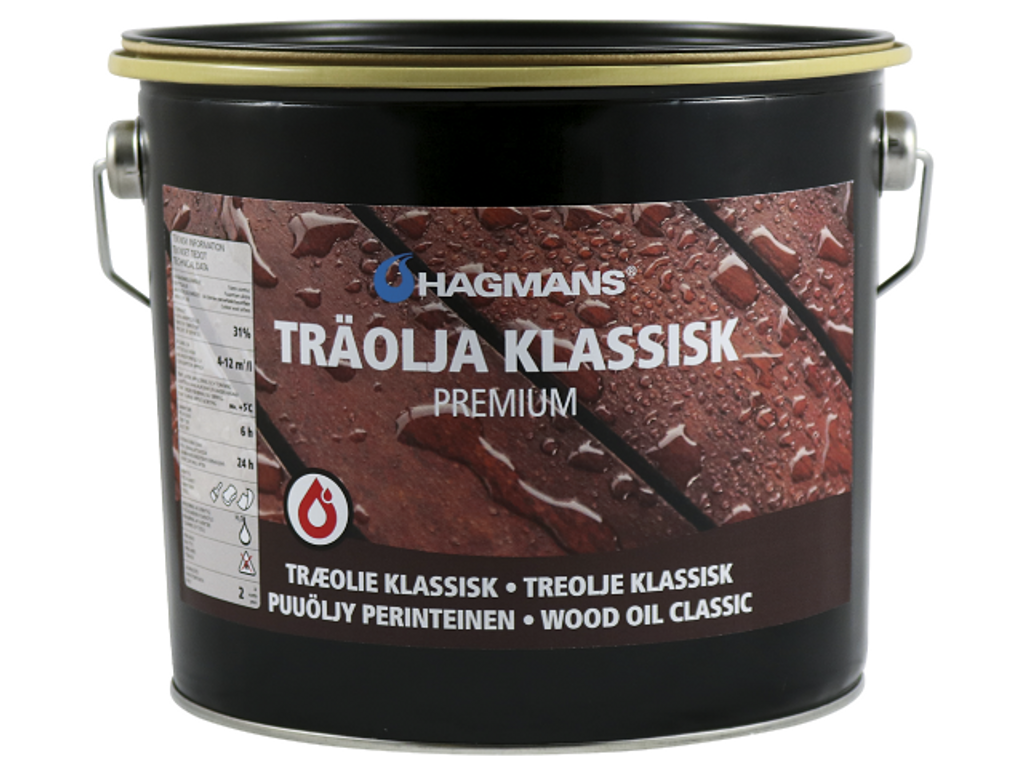 Hagmans Träolja Klassisk Premium är en högkvalitativ träolja för utomhusbruk. Perfekt för nytt, obehandlat trä och tidigare oljat eller tryckimpregnerat trä. Denna transparenta olja skyddar och bevarar träets naturliga skönhet.