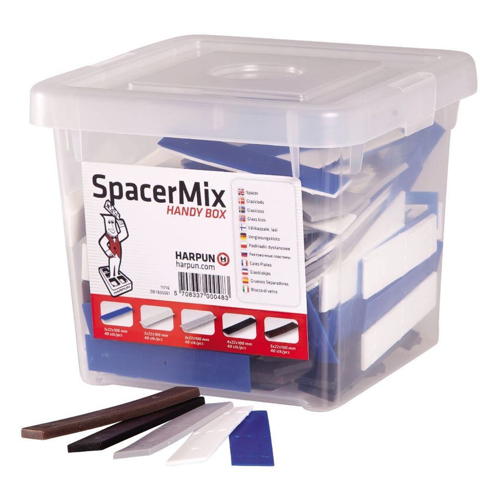 HARPUN GLASKLOSS SPACERMIX 200ST, Mixlåda med 200 st glasklossar i olika tjocklekar. Glasklossar används både inom- och utomhus vid justering och uppsättning av dörrar och fönster.