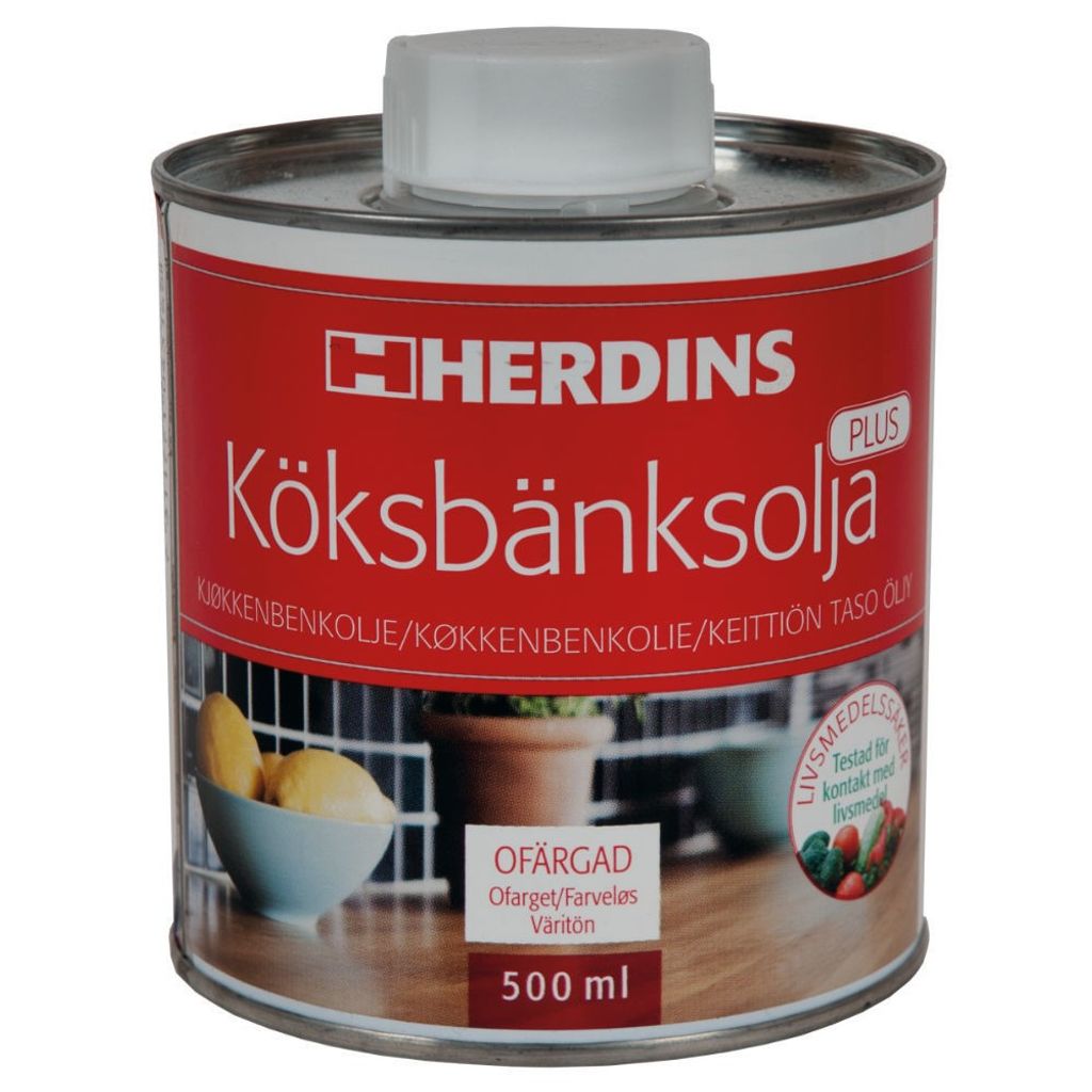 Herdins Köksbänksolja Plus är en specialolja för träytor i köket. Med noga utvalda oljor skyddar och vårdar den träet med vacker yta, bra vatten- och smutsavvisande egenskaper. Livsmedelssäker, 500 ml.