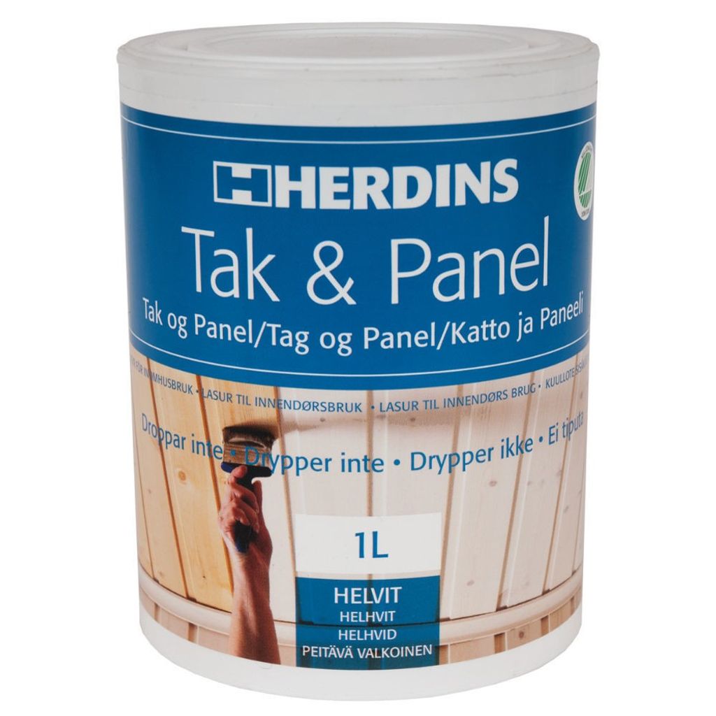 Herdins Tak & Panel är en miljömärkt (Svanen) vattenburen och droppfri lasyr för obehandlat eller tidigare lackerat barrträ inomhus. Den förebygger och reducerar gulning och kvistblödning. Du behöver inte använda kvistlack före behandling med Tak & Panel. Produkten ger gammal och gulnad panel en vacker ljus och sidenmatt yta.