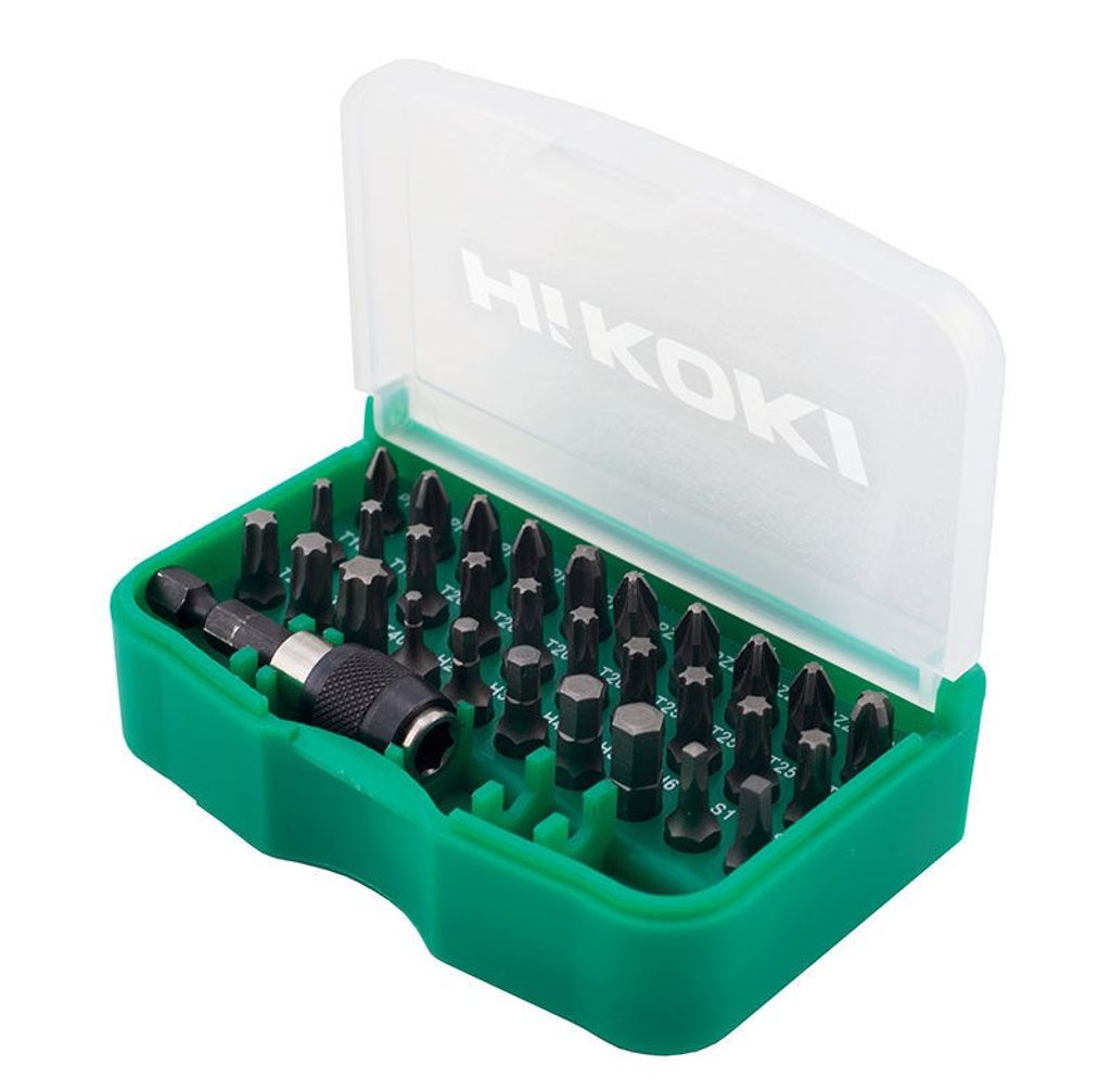 HiKOKI 31-delars bitsdsats i robust låda med bältesklämma och transparent lock.