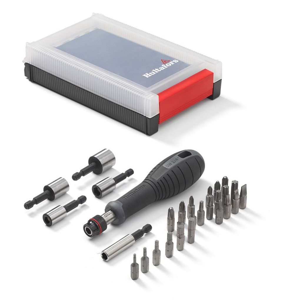 Set med korta bits och handtag i en praktisk plastlåda. Utvecklat för professionellt bruk tillsammans med hantverkare.