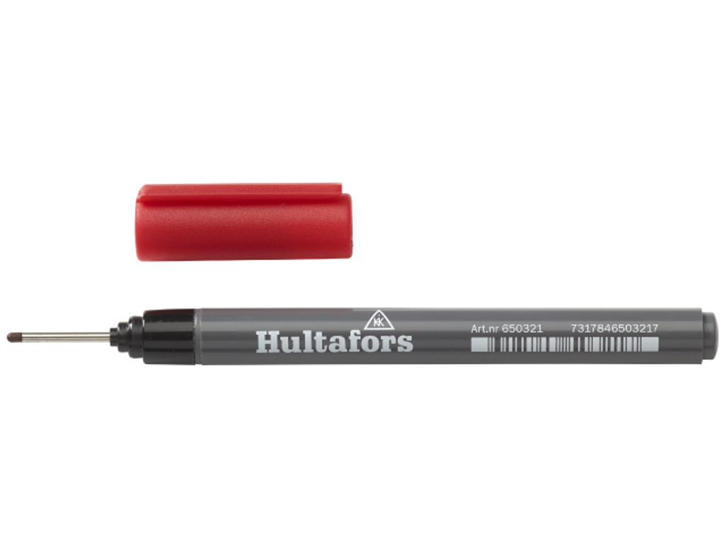 Tuschpenna för märkning där det är svårt att komma åt och i smala hål. Hultafors Djuphålsmärkare är anpassad för märkning i trånga utrymmen och i smala hål. Finns i röd och svart permanent tusch för att kunna användas på de flesta material och underlag.
