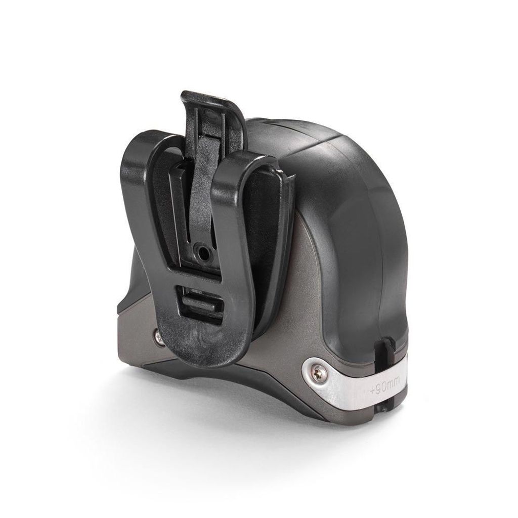 4-metersmodellen har ett smalt bältesclip i metall. 6-metersmodellen har ett avtagbart bältesclip med snabbkoppling som gör det lättare att lossa bandet med en hand. Ändhaken justerar sig mot nollpunkten vid intern mätning.