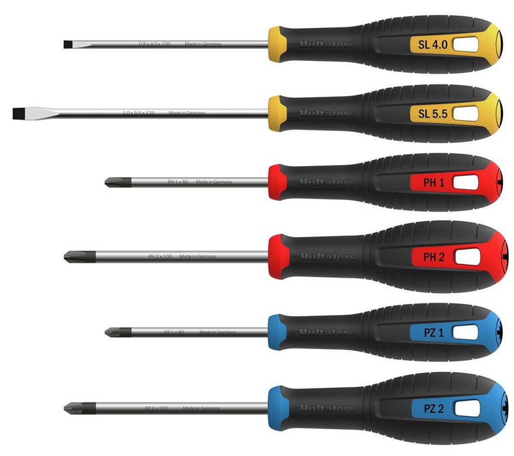 Hultafors skruvmejselsats med 3 av de vanligaste typerna av skruvmejslar, utvecklade för professionellt bruk tillsammans med hantverkare. Innehåller PH 1 och 2, PZ 1 och 2 samt spårskruvmejsel 4 och 5,5.