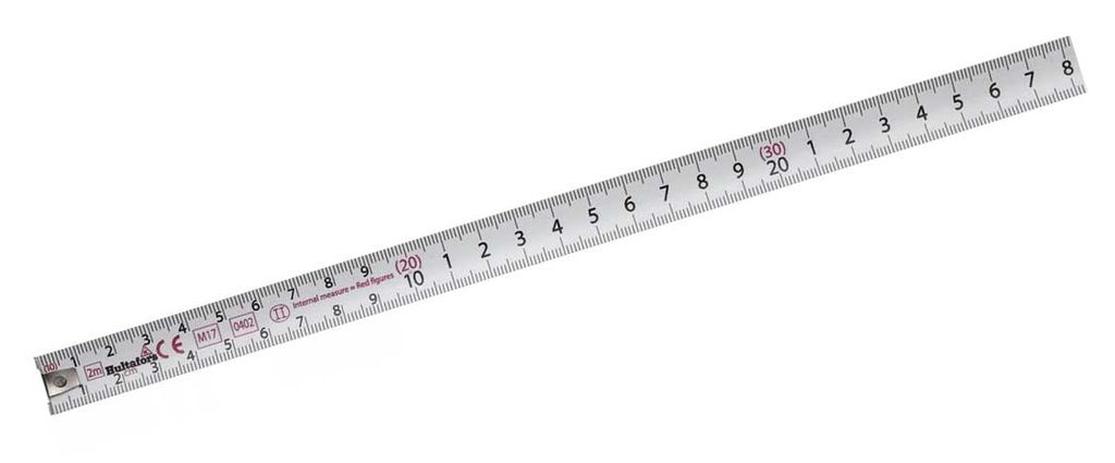 Vitt stryktåligt stålband, bandbredd 16 mm, gradering i millimeter, med kapsel i ABS-plast. Kombinerade märk- och mäteggar gör att du snabbt och enkelt kan mäta upp och märka ut både utvändiga och invändiga längder.