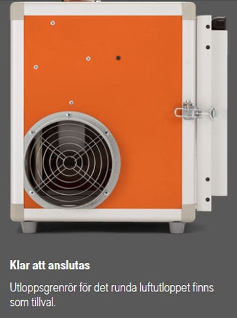 - Luftutblåset är riktat 90º från inloppet och försedd med utloppsstos på Ø160mm, för anslutning av evakueringsslang (max 8m)
