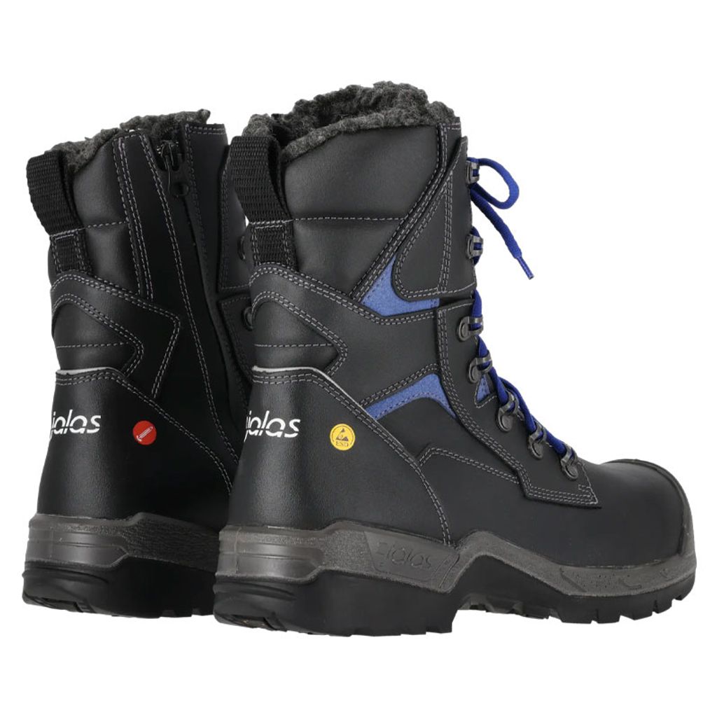 Skydden är genomtänkta från tå till häl. JALAS komposittåhätta skyddar utan att kyla ner foten, spiktrampskydd i stål stoppar vassa genomträngningar och dubbla stötdämpningszoner i Rogers Corporation PORON® XRD® tar upp stötar vid häl och framfot. ProNose tåslitskydd, bälgplös, polstrat skaft och snölås ger robusthet i vardagen. Snörning med dragkedja på sidan förenklar av och på och kängan levereras med blå och svarta skosnören för valfri stil i arbetet.