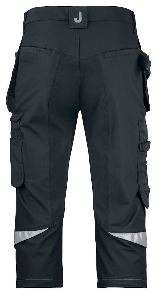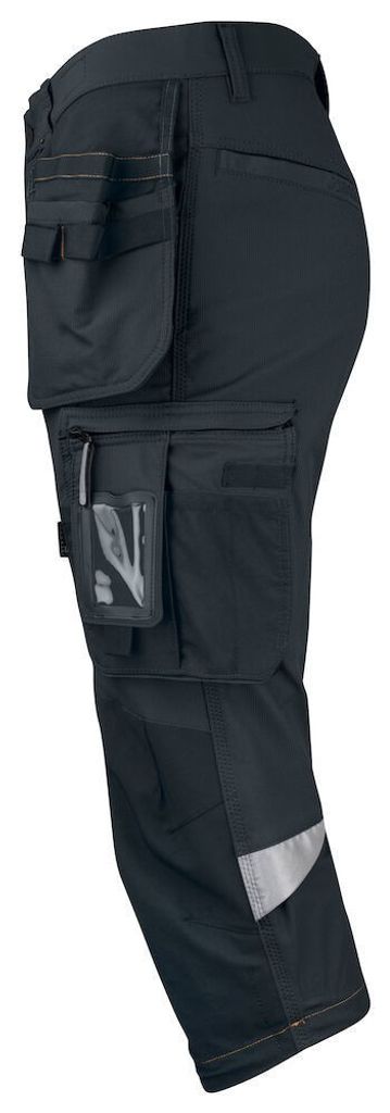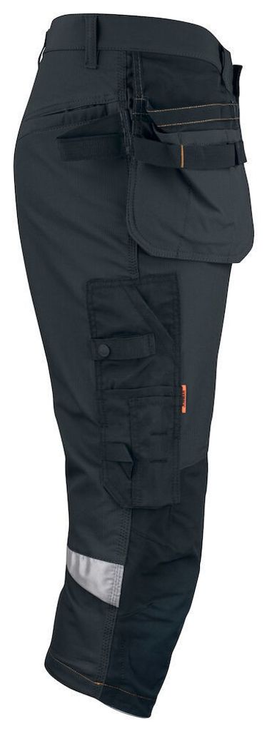 De snygga stolpfickorna bak, hammarhanken, tumstocksfickan med knivhållare och benfickan med täckt blixtlås, ID-kortsfack och telefonficka, erbjuder utmärkt funktionalitet och praktisk förvaring. Förböjda knän med knäskyddsfickor i slitstark stretch Cordura® och 3M™ reflexpasspoaler ger extra komfort och säkerhet. Knäskyddsfickorna har två höjdnivåer för att passa olika arbetsställningar. Mesh i knävecken förbättrar ventilationen, och reflexdetaljerna ökar synbarheten i mörka arbetsmiljöer.