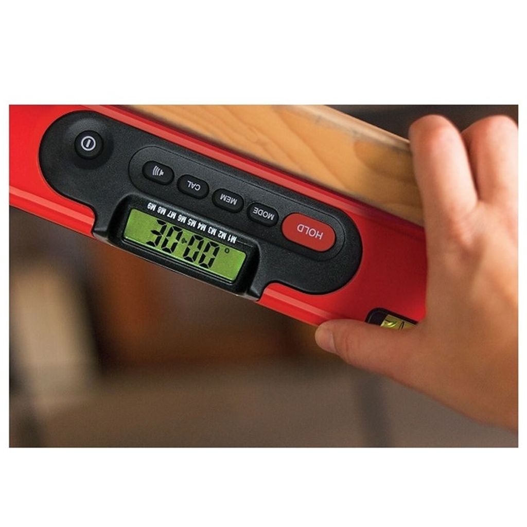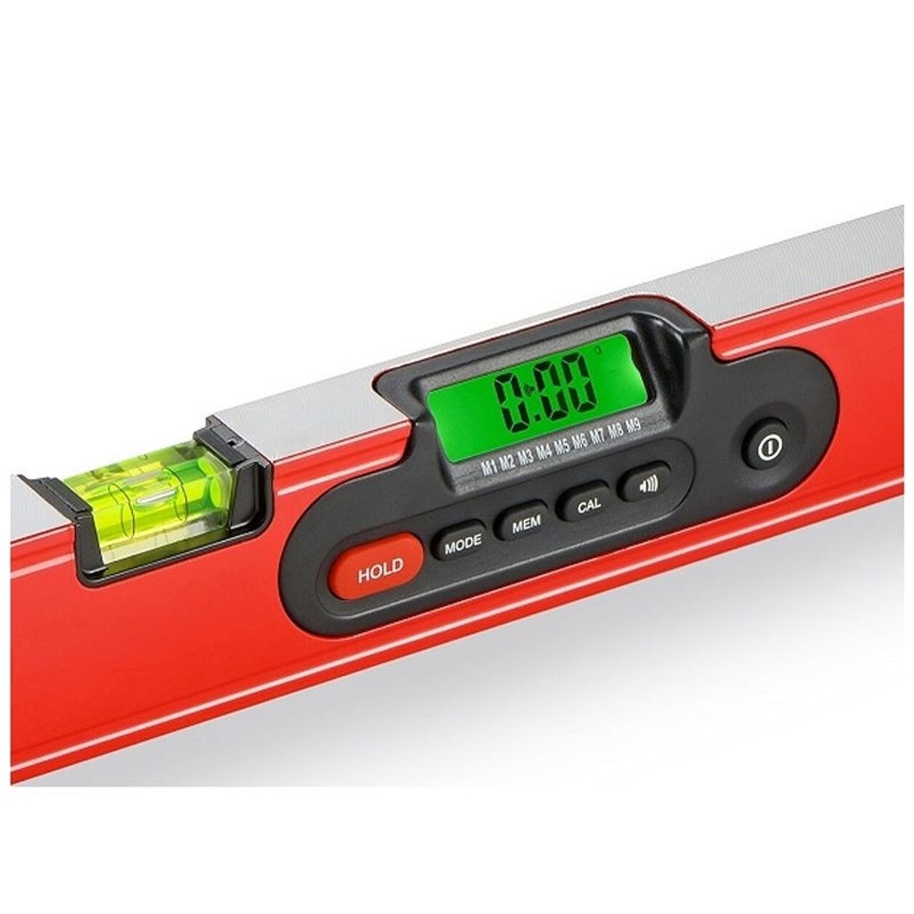 Funktionerna inkluderar HOLD-knapp för att låsa aktuell vinkel, minne för upp till 9 mätningar samt referensvinkel (falsk nolla) för enkel överföring av mätningar. Du får tydliga ljudsignaler vid 0°, 45° och 90°, samt vid valfri vinkel. Vattenpasset är IP54-klassat för damm- och fuktskydd och har kraftiga magneter för fastsättning på stålmaterial.