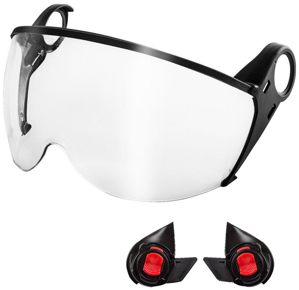 Reptåligt och imskyddsbehandlat visir i klar polykarbonat, kompatibelt med KASK Zenith X- och Primero-hjälmar. Ergonomiskt och uppfällbart visir med enkel montering via Easy Click-adaptrar – perfekt för användning tillsammans med glasögon.