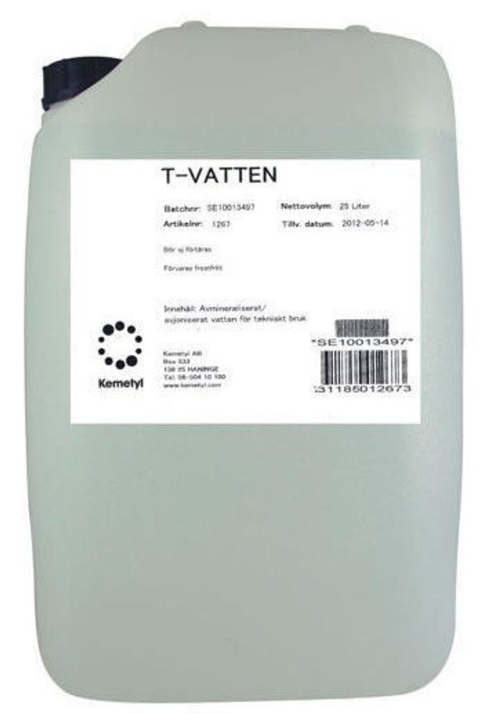 Kemetyl T-Vatten är en mångsidig lösning för ditt hushåll och tekniska behov. Detta 25-liters avjoniserade vatten är perfekt för användning i batterier, ångstrykjärn och för finrengöring av känsliga föremål som grammofonskivor och glasögon. Genom att använda T-Vatten i ditt ångstrykjärn kan du effektivt undvika problematiska kalkavlagringar, vilket förlänger livslängden på dina hushållsapparater. T-Vattens rena formula säkerställer optimal prestanda och skydd för en rad olika applikationer.