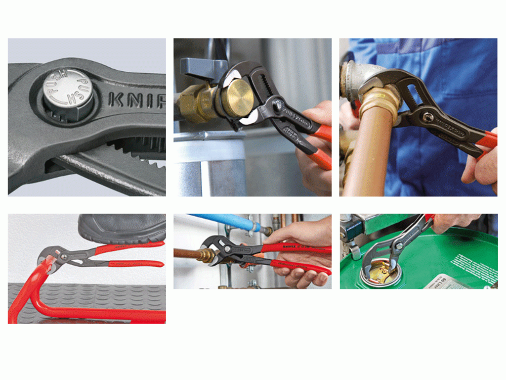 KNIPEX Cobra – Hightech-polygriptången. Inga besvärliga inställningar för den riktiga öppningsvidden längre. I stället: placera den övre käfthalvan på arbetsstycket, tryck på knappen och skjut fram den undre käften – genialt enkel.