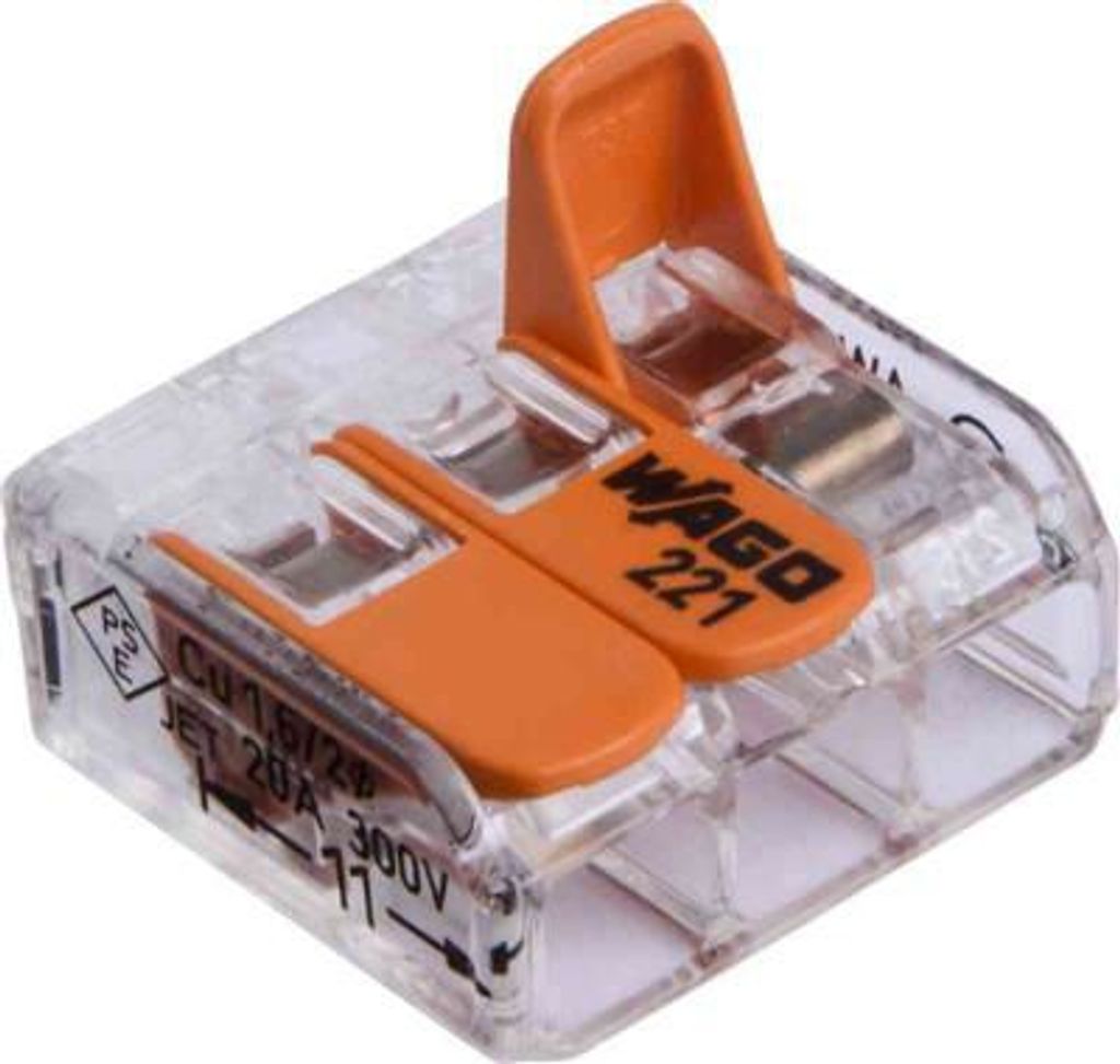 Kopplingsklämma Wago 221 ansluter flexibla ledare från 0,14-4 mm², samt en- och flertrådiga ledare från 0,2-4 mm². Det stora ledartvärsnittet ger möjlighet att ansluta olika typer av ledare och gör det möjligt att sammankoppla ledare med mycket varierande ledarareor. Den mindre storleken gör att kopplingsklämman kan användas i trånga utrymmen. Det helt transparenta huset ger den bästa säkerheten och pålitligheten i elinstallationer. Hävarmarna på Wago 221 kräver mindre kraft för att öppnas, vilket också ger möjlighet för snabb anslutning av ledarna utan verktyg. Fördjupningen på sidorna av klämman förhindrar att den glider och ger ett bättre grepp samt gör det enklare att hålla klämman medan den ansluts. Kopplingsklämman har två testhål; ett i ledaranslutningsriktningen och ett på motsatt sida. Dessa testhål gör det möjligt att utföra ett praktiskt test när ledaren är ansluten och i olika installationsmiljöer. Kopplingsklämman kan användas i en omgivningstemperatur på upp till 85° C.