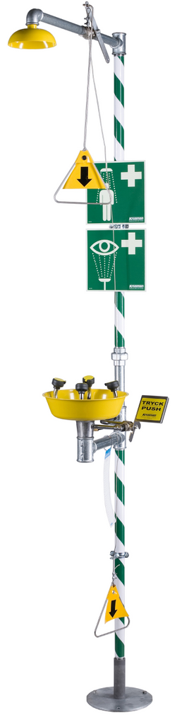 Fristående dusch av galvaniserade järnrör. Duschsil av syrafast stål. Kulventil, ej återgående, manövrerad med dragstång, samt draghandtag för krypande person.