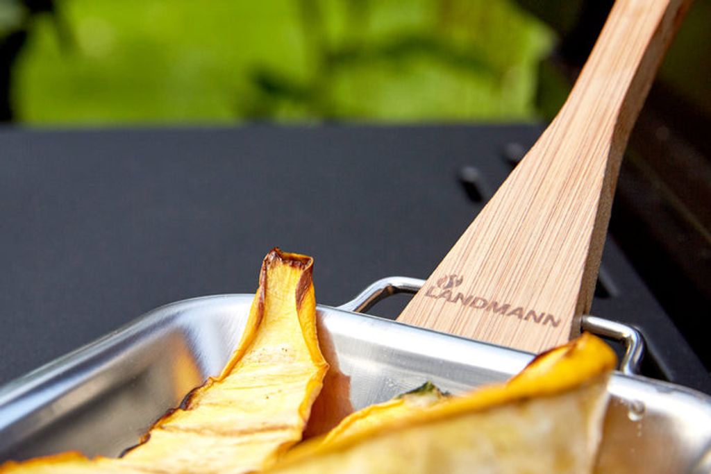 De medföljande bambuskraporna är en smart detalj som gör setet extra praktiskt. Skrapan fungerar som handtag till grillpannorna när de är varma, och kan även användas som spatel för att lyfta upp maten. Eftersom bambu är skonsamt mot ytan kan du servera direkt ur pannorna utan att repa dem.