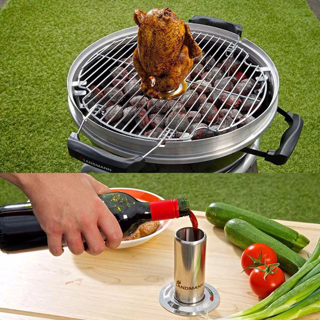 Landmann Kycklinghållare Beer Can 13442 i rostfritt stål gör det enkelt att tillaga hel kyckling saftigt och krispigt på grill med lock eller i ugn. Aromabehållaren på 250 ml fylls med öl, vin eller marinad för extra smak, och droppskålen fångar fett och vätska för renare grillning.