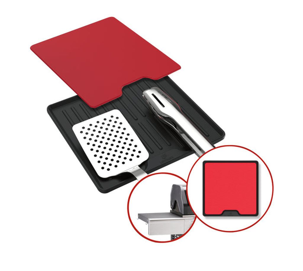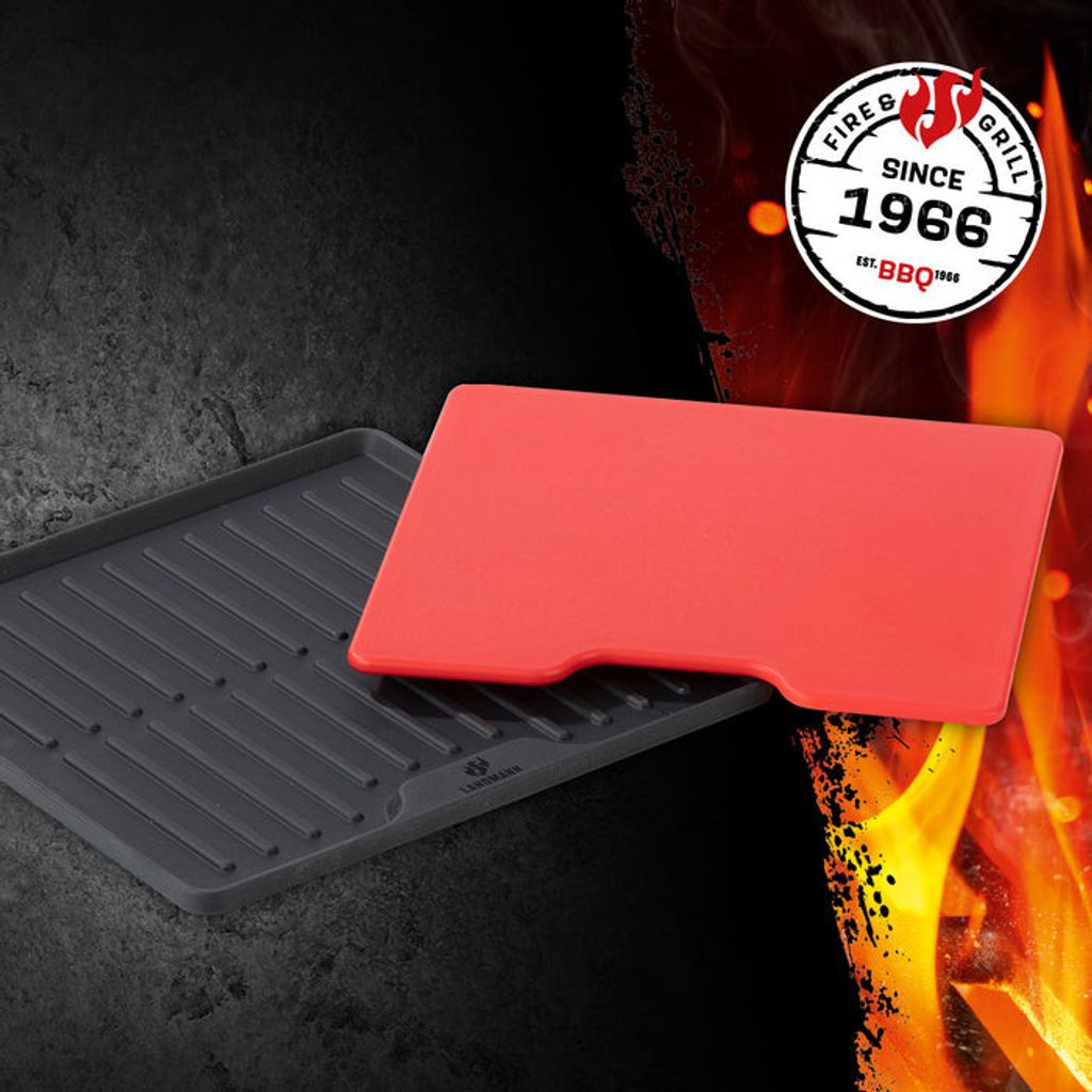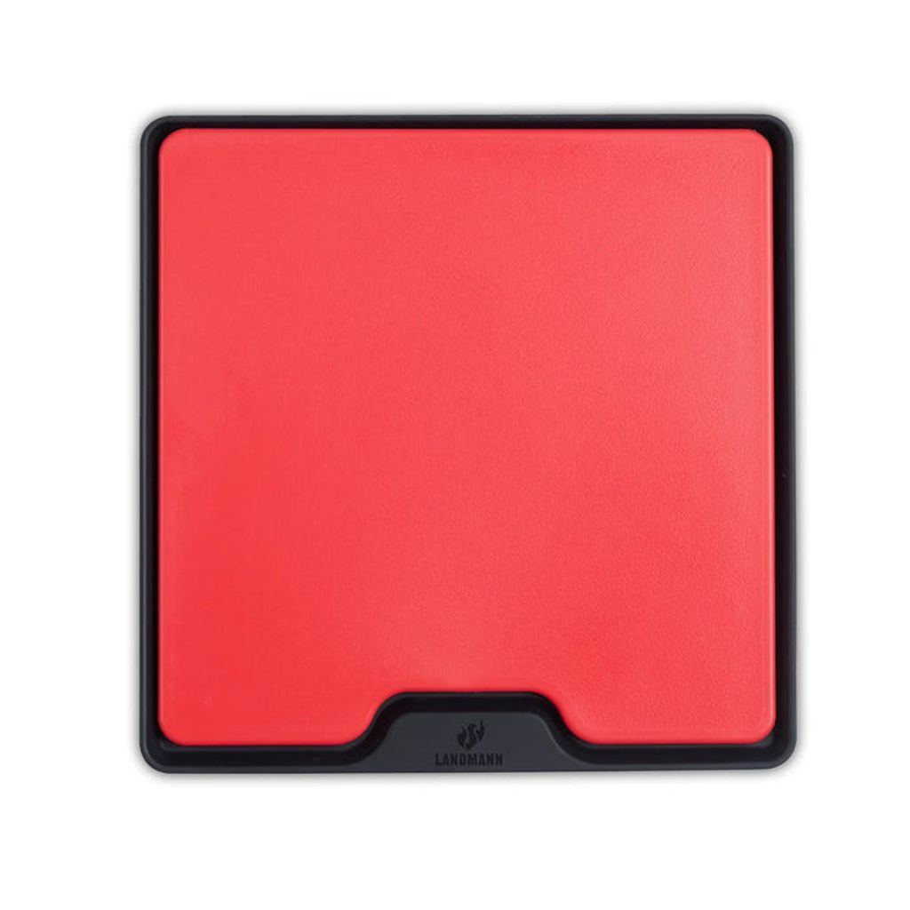Landmann skärbräda med integrerad droppskyddsmatta är en smart duo som håller grillbordet rent och organiserat. Skärbrädan i slitstark plast 6 mm har en lätt sträv yta som gör den perfekt för kött och grönsaker. Den 10 mm tjocka silikonmattan med noppor lyfter brädan och samlar upp kött och grönsakssaft så att inget rinner ut på sidobordet. Kompakt storlek 24,5 x 24,5 x 1 cm.