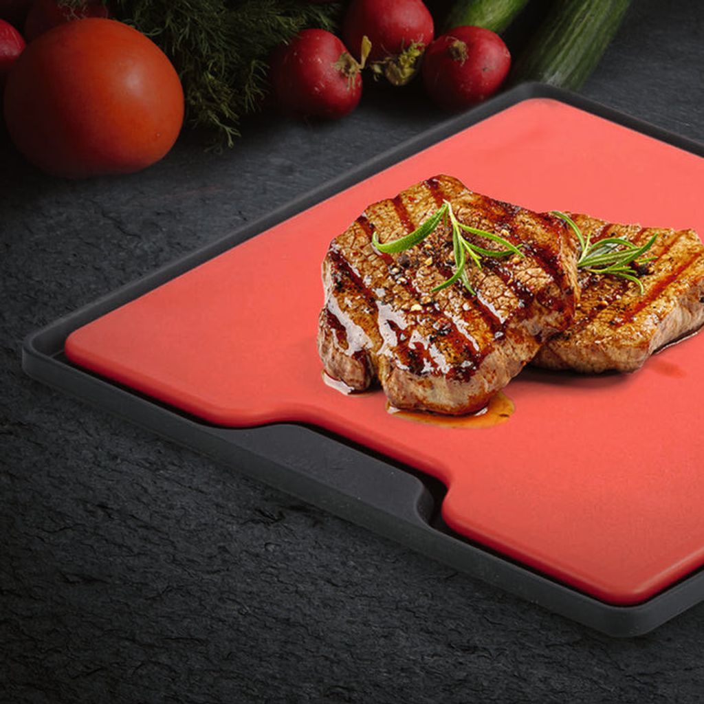 Skärbrädan är tillverkad i slitstark plast med 6 mm tjocklek och har en lätt sträv yta som minskar risken att råvaror fastnar. Det gör den smidig för allt från biffar och kyckling till tomater, svamp och paprika. Under brädan ligger en 10 mm tjock silikonmatta som fungerar som integrerat droppskydd. Mattans noppor lyfter skärbrädan och gör att vätska från kött och grönsaker samlas upp i mattan istället för att rinna ut på bordet. När du är klar häller du enkelt av vätskan och håller arbetsytan fräsch och hygienisk.