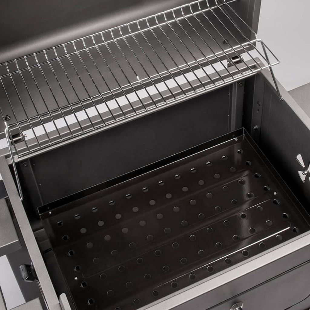 Perfekt för dig som vill grilla med kol och samtidigt ha kontroll över värmen. Passar för allt från snabb direkt grillning av burgare och korv till längre pass med indirekt värme genom att justera koltråget. Påfyllningsluckan gör den idealisk för längre grillkvällar där du vill fylla på bränsle eller addera rökspån för extra smak, och varmhållningsgallret är praktiskt när du grillar till flera.