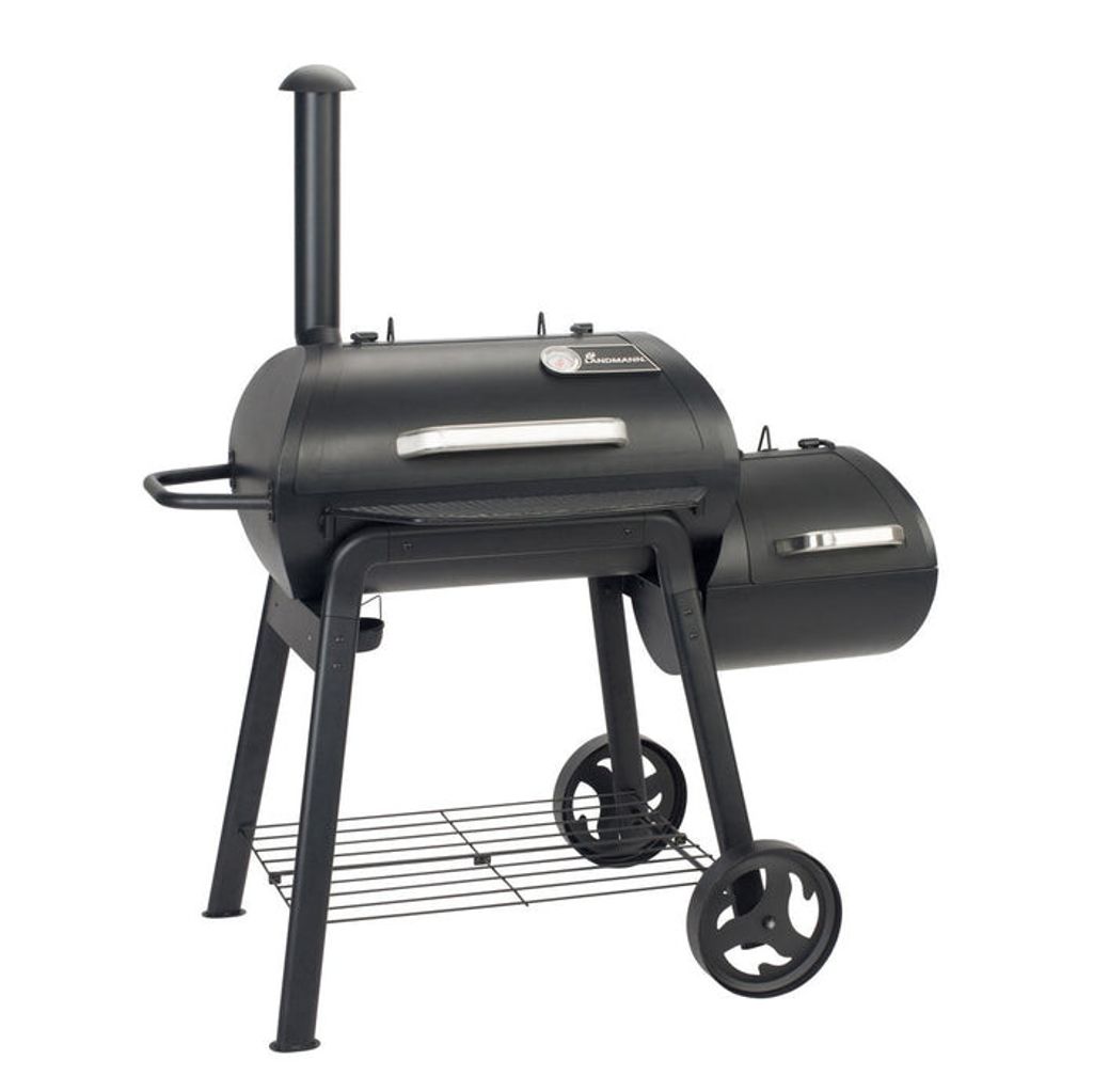 Landmann Vinson 300 Smoker är en kraftfull 4-i-1 smoker för direkt grillning, indirekt grillning, rökning och autentisk amerikansk BBQ. Med huvudkammare och sidokammare, emaljerade grillgaller och generös grillyta 81 x 44 cm + 42 x 40 cm får du maximal flexibilitet. Integrerad termometer, avtagbar fronthylla, varmhållningsgaller samt stora hjul gör den smidig att använda.