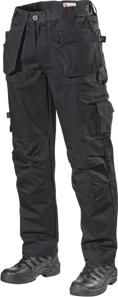 Två hängfickor, två framfickor samt benficka på vänster och tumstocksficka på höger sida. ID-kortsficka, hammarhank samt knäskyddsfickor i bomull.