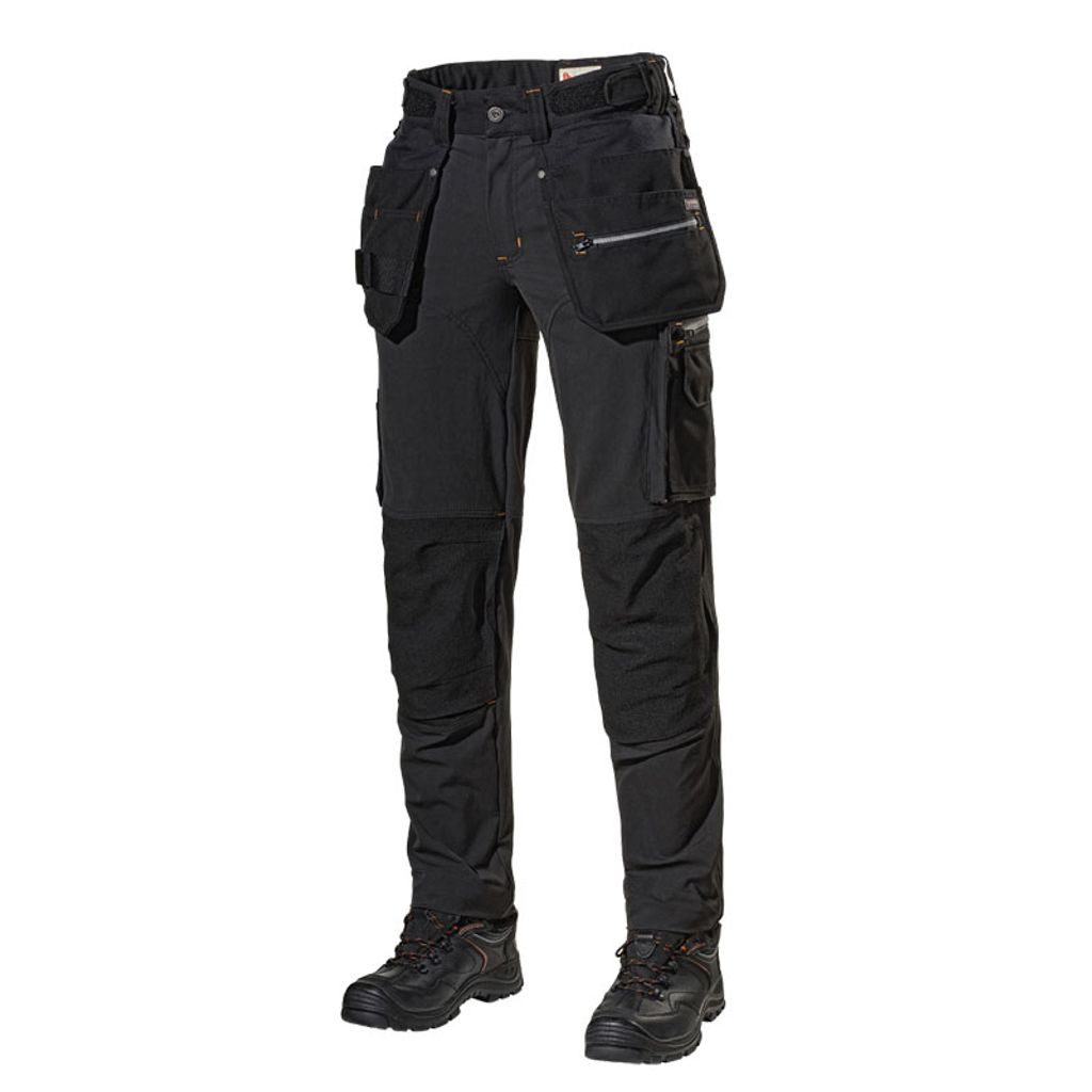 Organiserade för effektivt arbete har byxan spikfickor i fast material med extra fack och dragkedja för exempelvis bits, tumstocksficka, två framfickor och infällda stolpfickor bak. Benfickan med dragkedja skyddar mindre verktyg, och den vinklade telefonfickan med magnetlås säkrar mobilen när du rör dig. Två hängfickor med id korthållare på höger sida underlättar identifiering. Byxan är nedläggningsbar med fem centimeter för att enkelt justera längden.