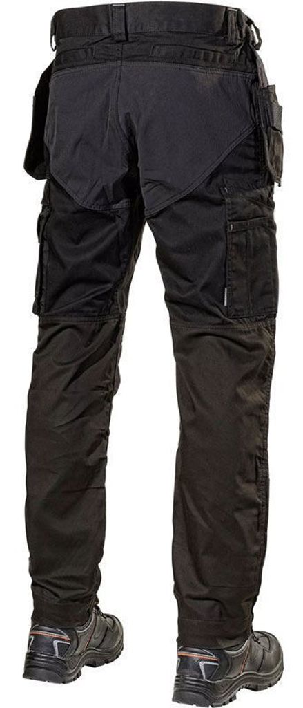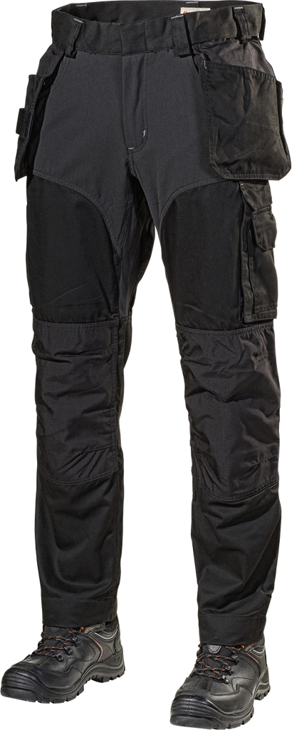 Funktionaliteten utökas med förböjda knän som förbättrar passformen och flexibiliteten, samt med flera genomtänkta fickor. De avtagbara hängfickorna är fästa med kardborreband och erbjuder snabb åtkomst till verktyg och tillbehör. Förstärkta fram- och bakfickor, en benficka med en särskilt utformad vinklad telefonficka med magnetlås, samt invändiga knäskyddsfickor i två olika höjder, adderar till byxans praktiska design.